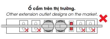 - Thiết kế mới với các ổ căm nằm ngang giúp cho các phích cắm không bị vướng như loại ổn cắm dọc khác trên thị trường