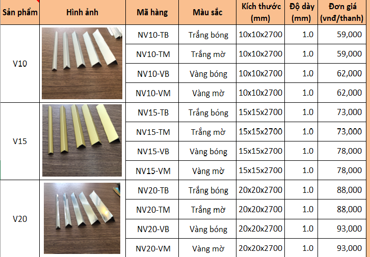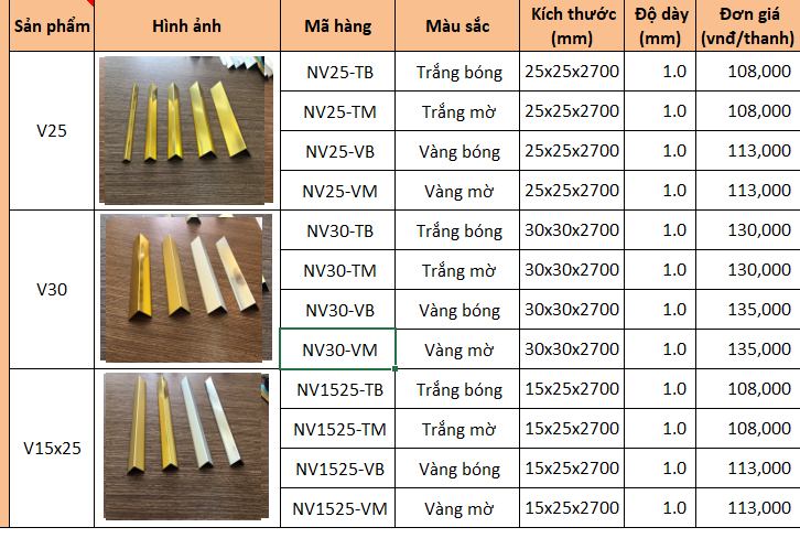 Hiện nay, giá các loại nẹp nhôm hình chữ V dao động từ 103.000 vnđ đến 135.000 vnđ. Bạn có thể tham khảo chi tiết giá của từng loại nẹp V nhôm trong bảng dưới đây.