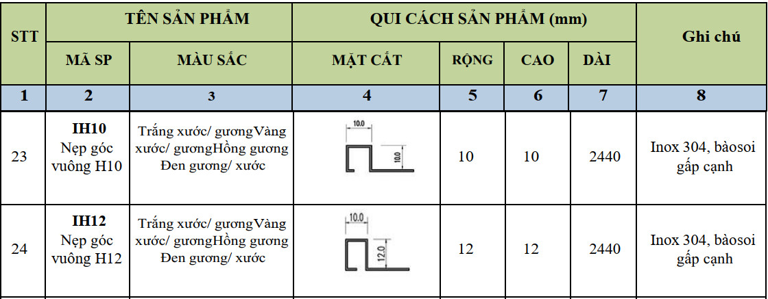 - Màu Sắc Đa Dạng: Nẹp inox góc vuông H12 có sẵn trong nhiều màu sắc khác nhau như bạch kim, vàng vàng, vàng đồng, đen bóng, và nhiều màu sắc khác để bạn lựa chọn theo ý thích và phù hợp với trang trí tổng thể của không gian.